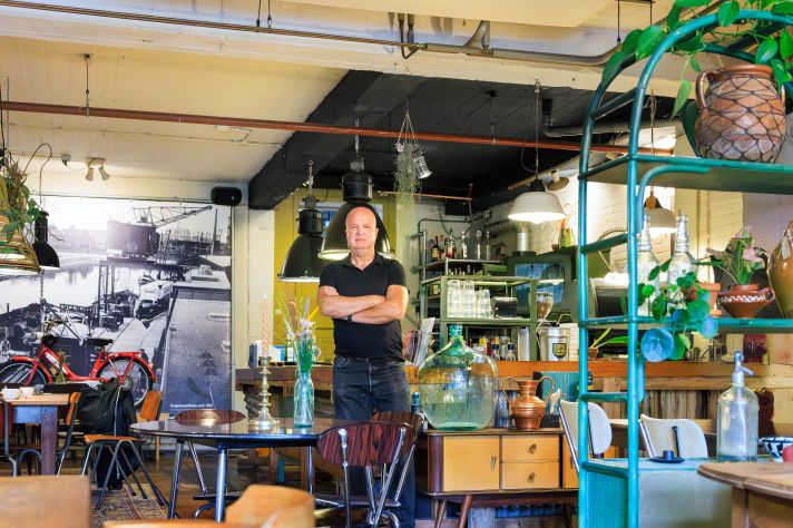 Oude schoolstoelen, een klassieke bromfiets, een foto van de Oosterhamrikkade in 1950: het interieur lijkt op een vintagewinkel. En dat is niet zomaar. Van de tafel waar een gast aan eet tot aan de lamp aan de muur: bijna alles in Salmagundi's is te koop.
