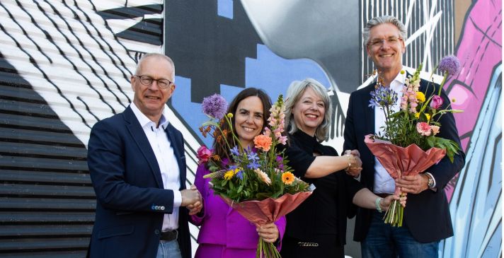 Foto | v.l.n.r. Hans Schülski (NHL Stenden), Sandra Pot (VNO-NCW MKB Noord), Agnes Mulder (VNO-NCW MKB Noord) en Marc Otto (NHL Stenden)